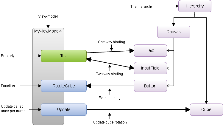 OneWayPropertyBinding is the glue that data-binds the text property in the view to the Text property in the view-model. The value of the property is propagated in only a single direction, meaning that changes to the view-model are propagated to the view but not the other way. This makes sense because a text field in Unity is non-interactive: its value can't be changed in the UI so there is nothing that needs to be propagated back to the view-model.